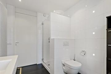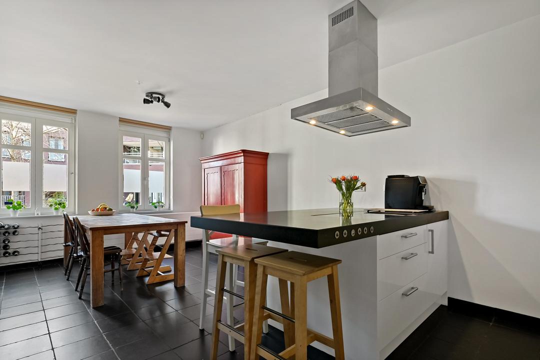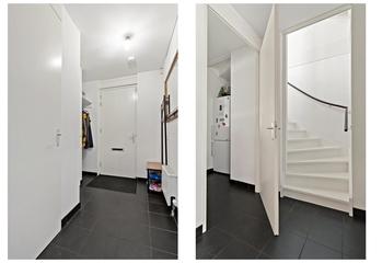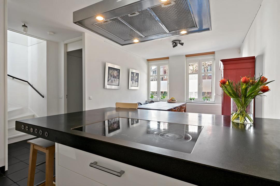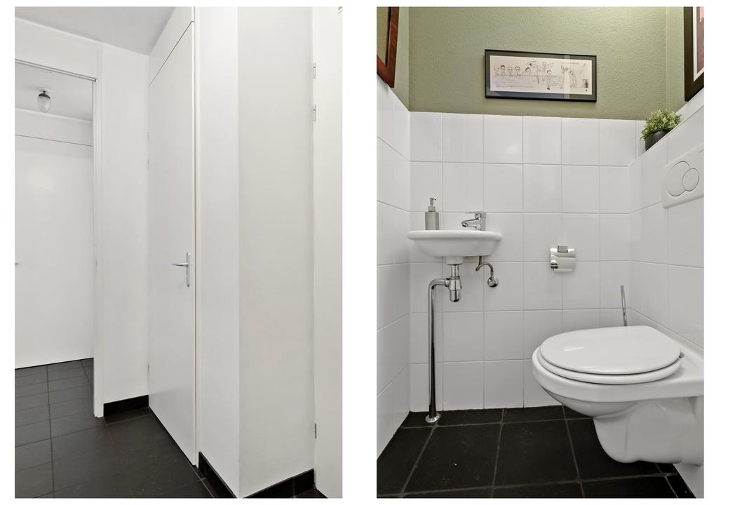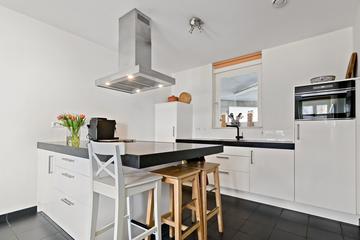 De entree van de woning biedt toegang tot een ruime hal met een modern toilet voorzien van een vrijhangend toilet, fontein en de meterkast. Vanuit hier toegang tot de royale woonkeuken, het hart van het huis, met een tijdloze, witte keuken met een kookeiland met eetbar en extra opbergruimte aan beide zijden. De keuken is uitgerust met een elektrische kookplaat, afzuigschouw, koelkast, combi-oven en vaatwasser. Vanuit de keuken is toegang tot de praktische bijkeuken/berging met directe toegang tot de gezamenlijke afgesloten binnentuin met overdekte parkeerplaats gelegen direct achter de woning.