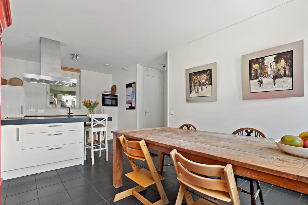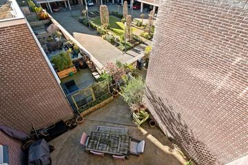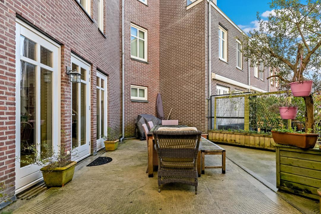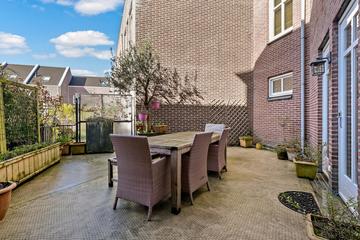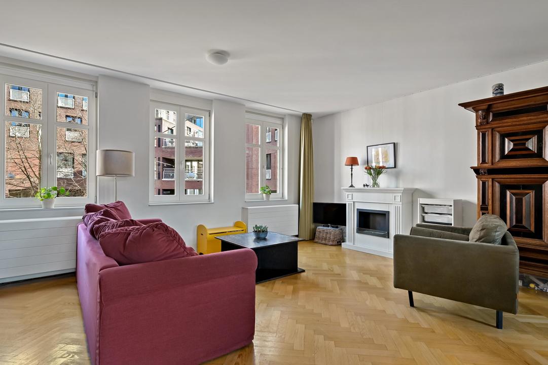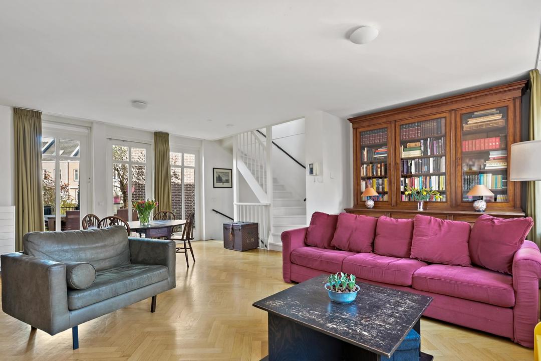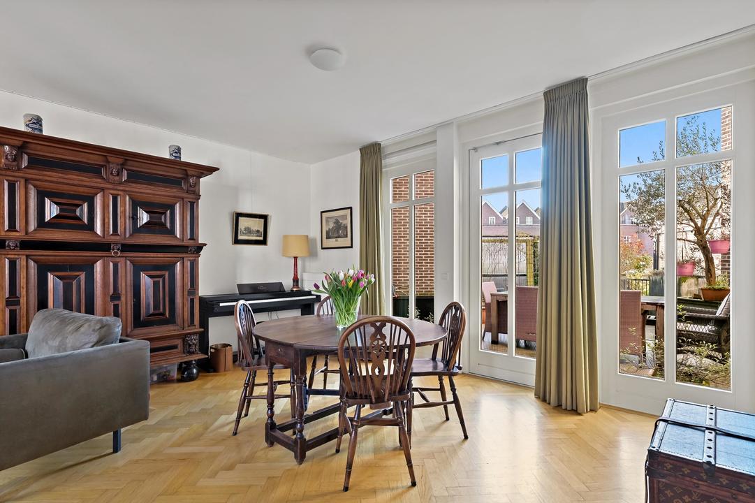 De eerste verdieping is volledig ingericht als woonkamer en biedt dankzij de grote raampartijen aan zowel de voor- als achterzijde een zee aan licht. Aan de achterzijde geven openslaande deuren toegang tot een ruim, zonnig terras op het zuidwesten met fraai uitzicht over de binnentuin, een heerlijke plek om van de middag- en avondzon te genieten.