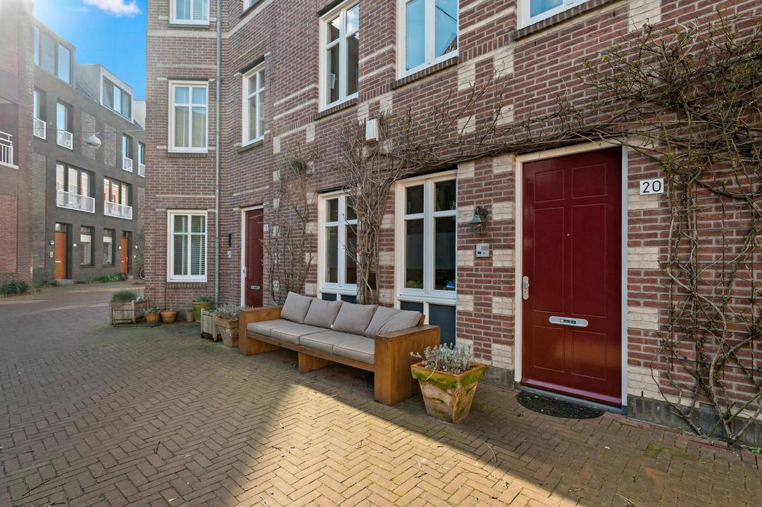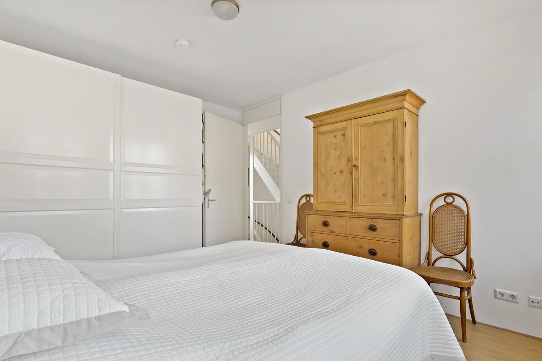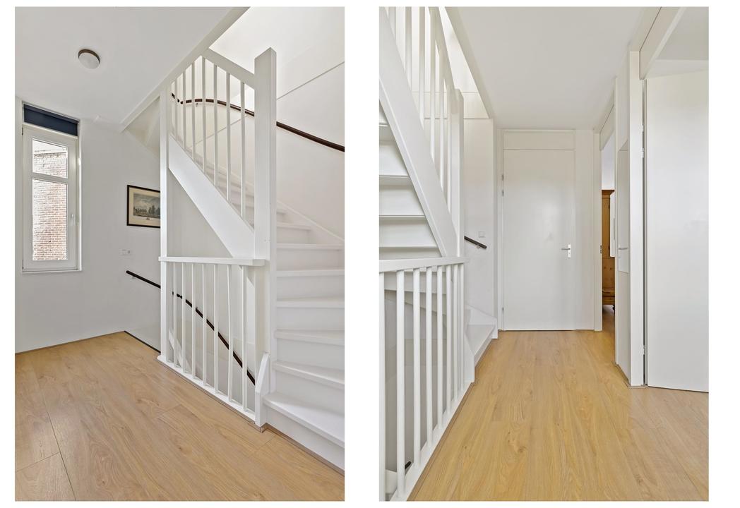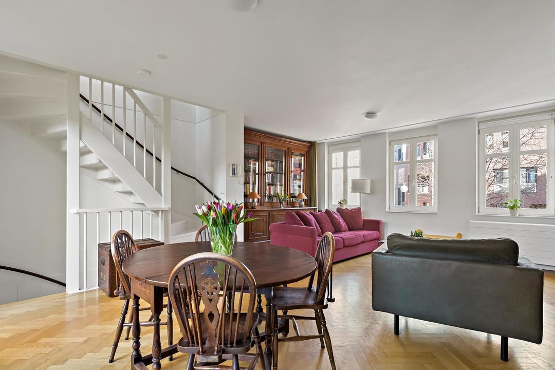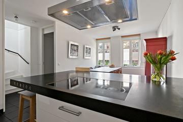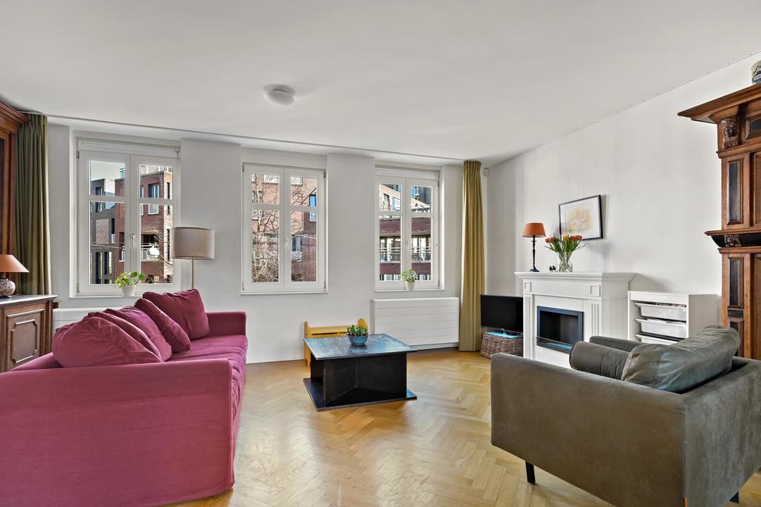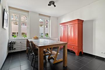 De eerste verdieping is volledig ingericht als woonkamer en biedt dankzij de grote raampartijen aan zowel de voor- als achterzijde een zee aan licht. Aan de achterzijde geven openslaande deuren toegang tot een ruim, zonnig terras op het zuidwesten met fraai uitzicht over de binnentuin, een heerlijke plek om van de middag- en avondzon te genieten.