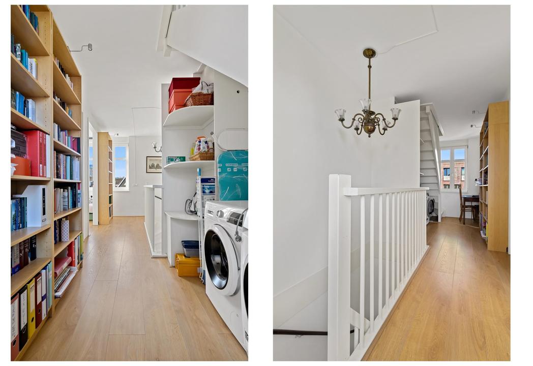Overloop met aansluitingen voor wasmachine en droger, opstelplaats van de unit voor mechanische ventilatie en vaste trap naar de kapverdieping. Slaapkamer 3 aan de voorzijde en slaapkamer 4 aan de achterzijde.