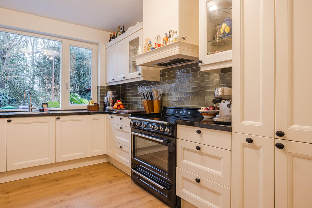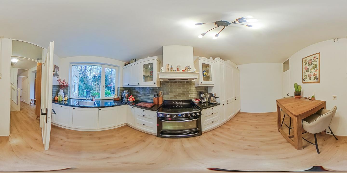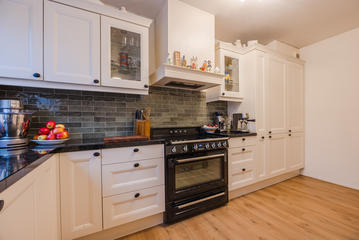 De woonkeuken is uitgevoerd met een keukenblok in L-opstelling en is uitgerust met een groot SMEG-fornuis met 5-pits inductiekookplaat en grote oven, een afzuigkap in schouw, vaatwasser, koelkast en vriezer. Daarnaast bevinden zich hier een vaste kast met opstelplaats van de cv-combiketel en een royale L-vormige berg-/voorraadkast met wasmachine- en drogeraansluiting.