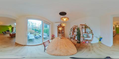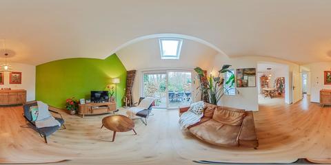 De lichte, L-vormige woonkamer vormt het hart van de woning en is voorzien van een Velux dakraam en twee schuifpuien die zorgen voor een prachtige lichtinval en een directe verbinding met de zeer ruime, zonovergoten achtertuin. De tuin is vrij gelegen en biedt volop privacy, ruimte en met de gehele dag de zon.