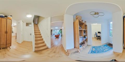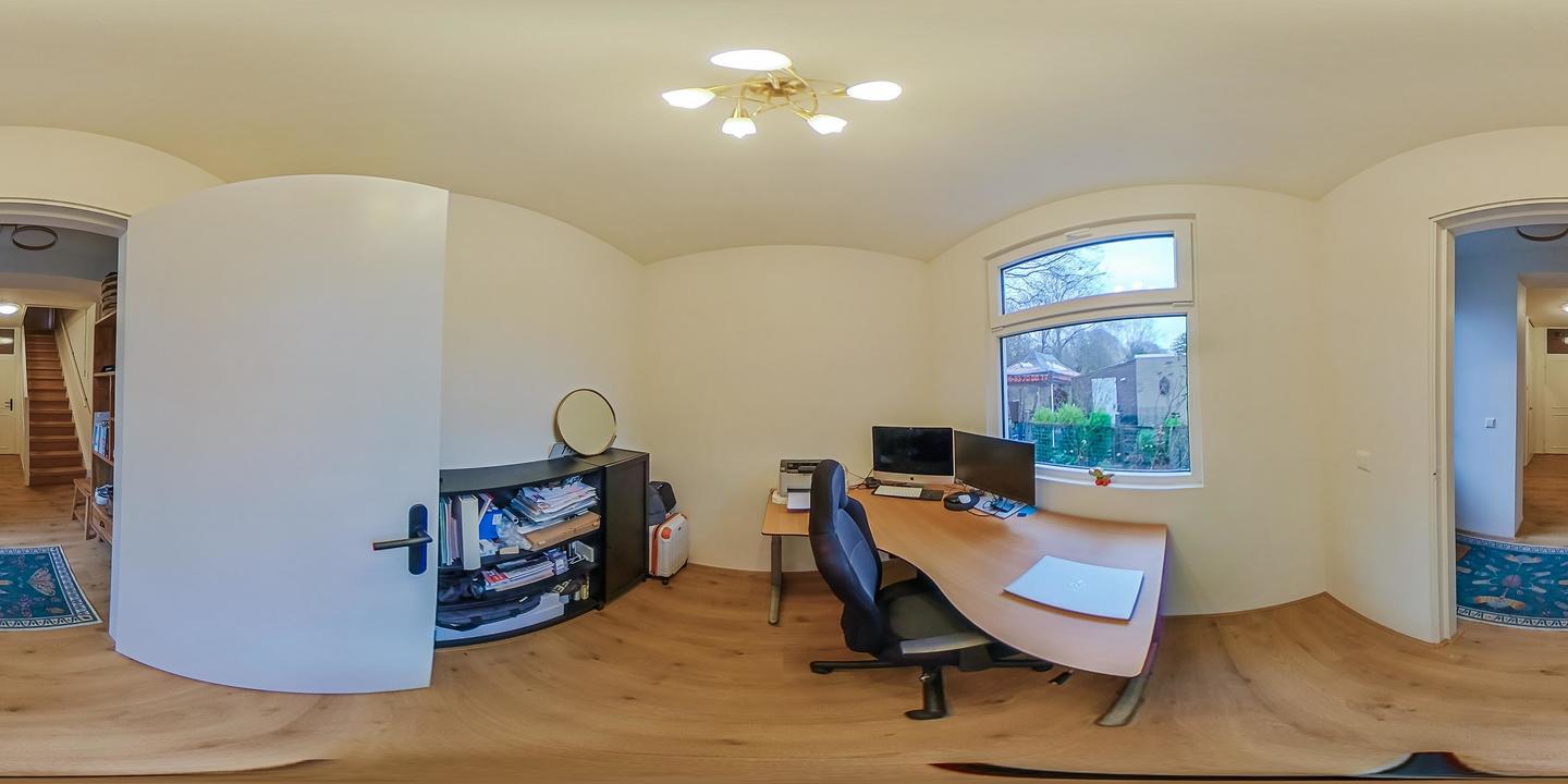 Via autoluwe straat wordt de woning bereikt. Voortuin met ruime (ca. 7m2) houten berging en toegang tot de woning. Hal met meterkast, modern toilet voorzien van een vrijhangend closet en fontein en trap naar de 1e verdieping. Vanuit de hal is de extra kamer op de begane grond bereikbaar, ideaal voor thuiswerken, speel- of hobbykamer.
