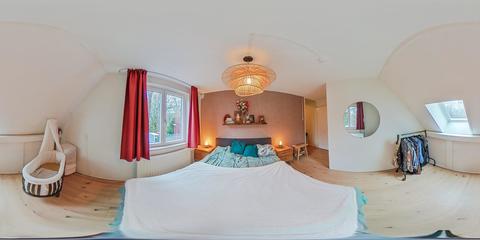 Overloop met praktische bergruimte boven trappengat. Ruime eerste slaapkamer met inloopkast. De moderne badkamer is voorzien van een inloopdouche, wastafel in meubel, tweede toilet en design radiator. Tweede slaapkamer.