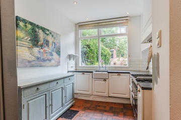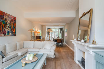 De brede woonkamer met sfeervolle erker en glas-in-lood bovenlichten vormt een lichte en royale leefruimte, voorzien van open haard en ornamenten plafonds. Aan de tuinzijde ligt de open keuken in L-opstelling, uitgerust met diverse inbouwapparatuur: een groot fornuis met twee ovens, vier gaspitten en bakplaat, afzuigschouw, vaatwasser en een losse Amerikaanse koelkast. Vanuit de woonkamer is de zonnige achtertuin bereikbaar, gelegen op het zuidoosten en voorzien van een houten berging. In de zomer schijnt hier de zon van 08.00 tot 19.00 uur.