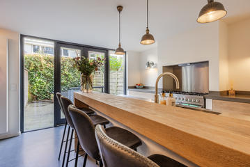 Bijzonder detail: in de keuken is een gedeelte van de balkenlaag van de eerste verdieping in het zicht gelaten met een glazen vloer erboven, wat zorgt voor een unieke doorkijk en een prachtige visuele verbinding tussen de woonlagen.