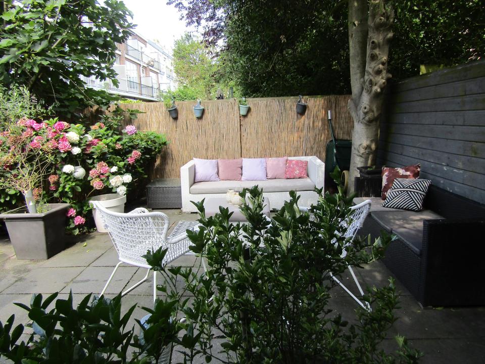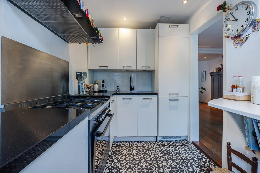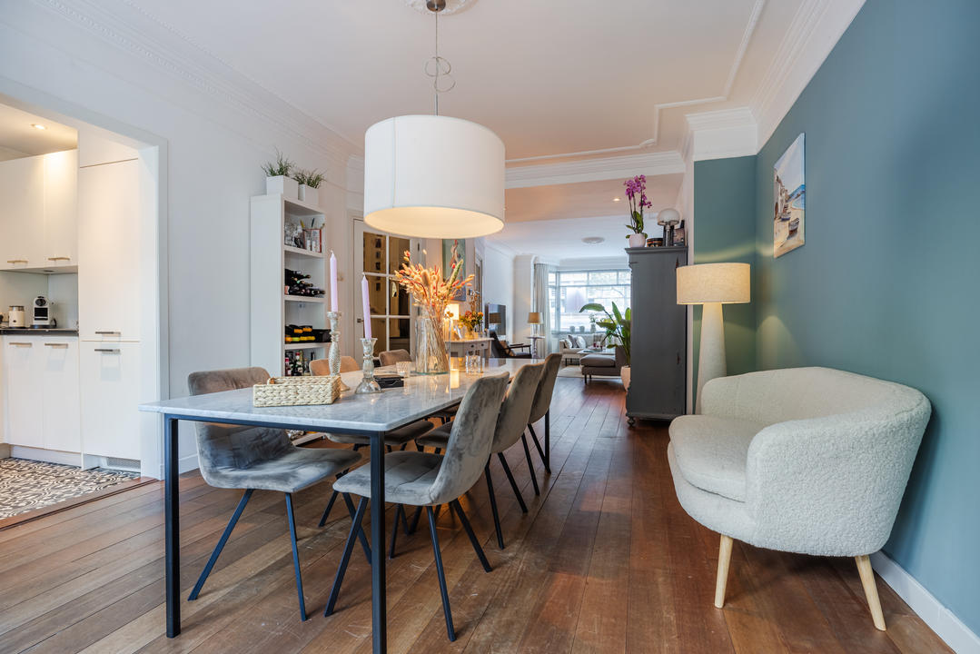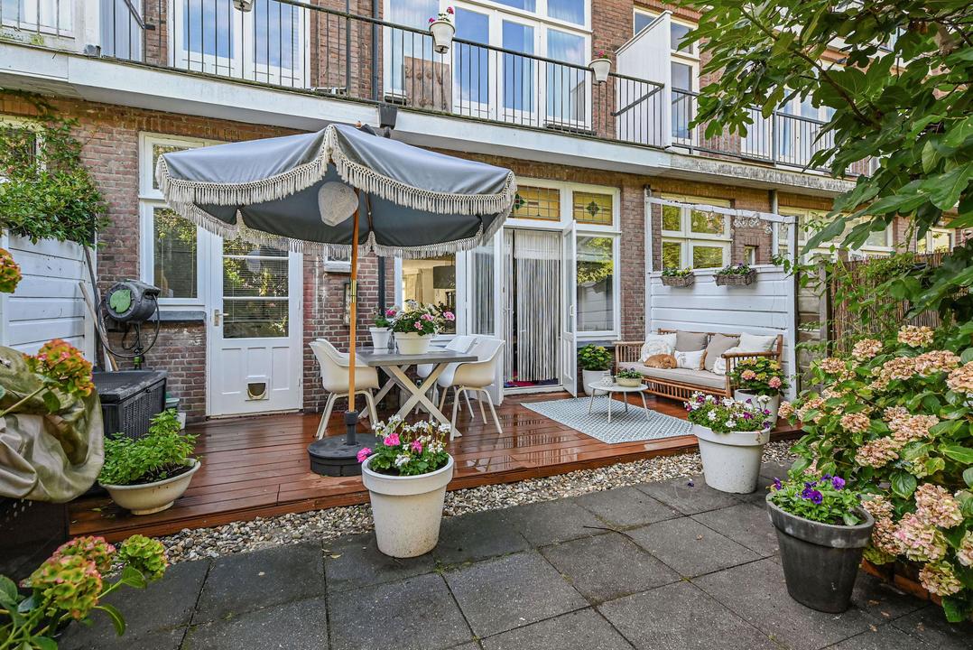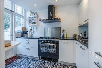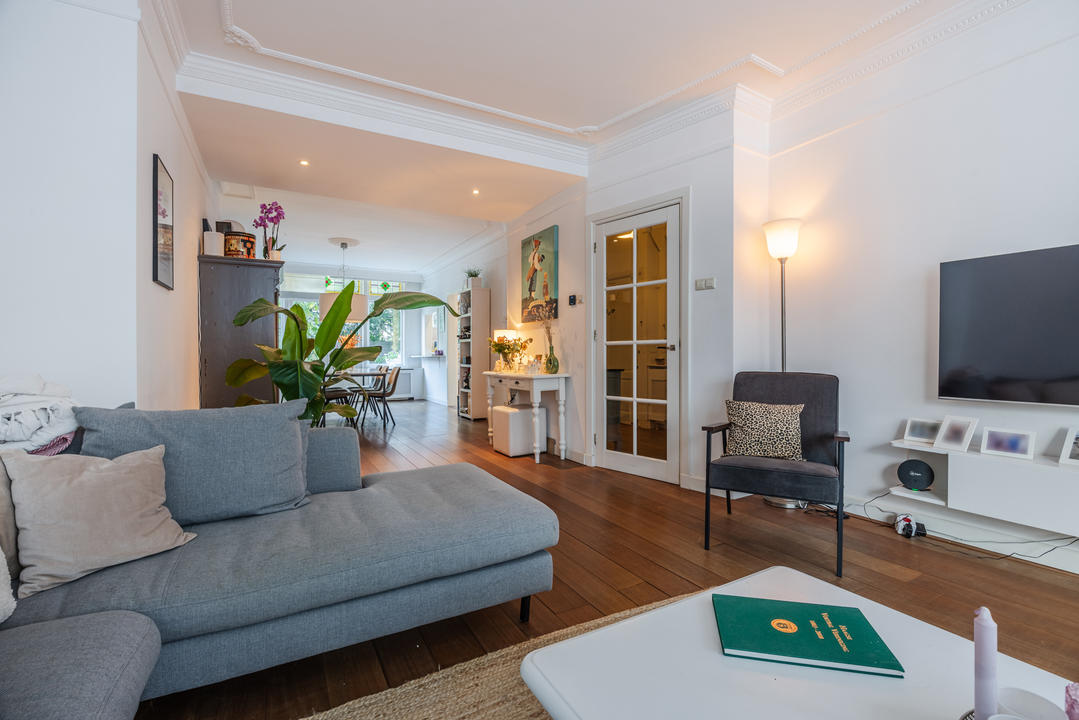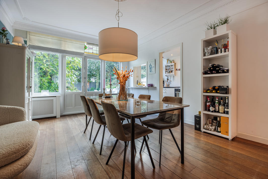 Entree op straatniveau met vestibule voorzien van mozaďekvloer en tochtdeur en raam met glas-in-lood tot de hal met toegang tot de kelder en een vergroot toilet met vrijhangend toilet en fontein. De woonkamer beschikt over openslaande deuren naar de diepe achtertuin, gelegen op het noordoosten.Vanuit de woonkamer toegang tot de halfopen keuken met modern keukenblok in L-opstelling, voorzien van inbouwapparatuur zoals een groot fornuis met zes gaspitten en wokbrander, grote oven, afzuigkap, vaatwasser, koelkast en close-in boiler. Ook vanuit de keuken is er toegang tot de tuin.